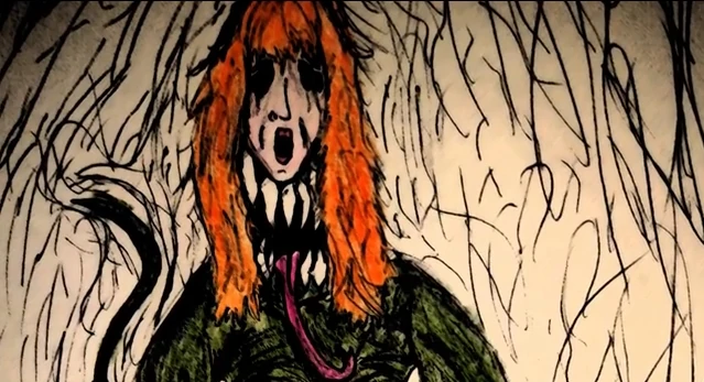 La niña parecía un cascaron rompiéndose para dar a paso a una criatura con proporciones mucho mas grandes que las del el pequeño cuerpo de la niña. La criatura aprovecho la piel de la cabeza de la madre para ponérsela de mascara que por cierto dejaba a la vista una horripilante sonrisa, muy parecida a la del muñeco.