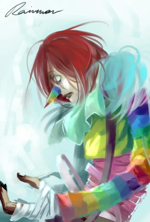 De repente, escuchó un ruido fuerte proveniente de la cama, detrás de él. Se dio vuelta para presenciar la caja de madera sacudirse violentamente. Entonces, sin previo aviso, la parte superior de la caja se abrió y un desfile de humo de colores y confeti salió de allí. Isaac se frotó los ojos con incredulidad sobre lo que estaba viendo. A medida que el humo se disipaba, el niño pudo distinguir que allí estaba un hombre alto y delgado, era un payaso multicolor, tenía el pelo de color rojo brillante, una nariz de cono anillada con los colores del arcoíris, y en los hombros plumas color cían sobre blanco; este se sentó encima de su traje de payaso andrajoso y colorido.