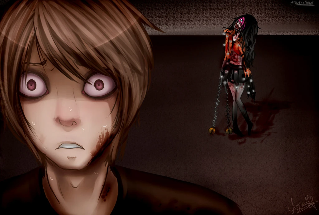 Acto seguido, soltó a mi hermano bruscamente, haciendo que la cadena se desenroscara de su cuello, girando y desgarrando su carne hasta dejarlo caer en el suelo. Lentamente, ella empezó a caminar hacia mí, con la cabeza gacha y riendo entre dientes. Ya no podía soportarlo más, y ante esto, lo único que se me ocurrió hacer hacerle frente con cualquier cosa que encontrara en la cocina. Abrí rápidamente uno de los cajones de un mueble que tenía enfrente de mí, tomé un cuchillo y corrí hacia ella. Le salté encima, agarrando sus dos manos, e inmovilizándola y quitándole la cadena, la tiré al suelo y empecé a clavárselo de manera brusca en todo el cuerpo. Increíblemente, ella no opuso resistencia, en vez de eso, solo ensanchaba más y más su sonrisa, riendo a carcajadas, mientras que una espesa sangre de color rojo vivo brotaba de sus puñaladas, dejando a la vista sus tendones y venas. Su cuerpo estaba cada vez más desfigurado, y sus cortaduras cada vez más grandes a medida que yo clavaba el cuchillo con más intensidad, hasta que por fin dejó de reír y de moverse por completo.