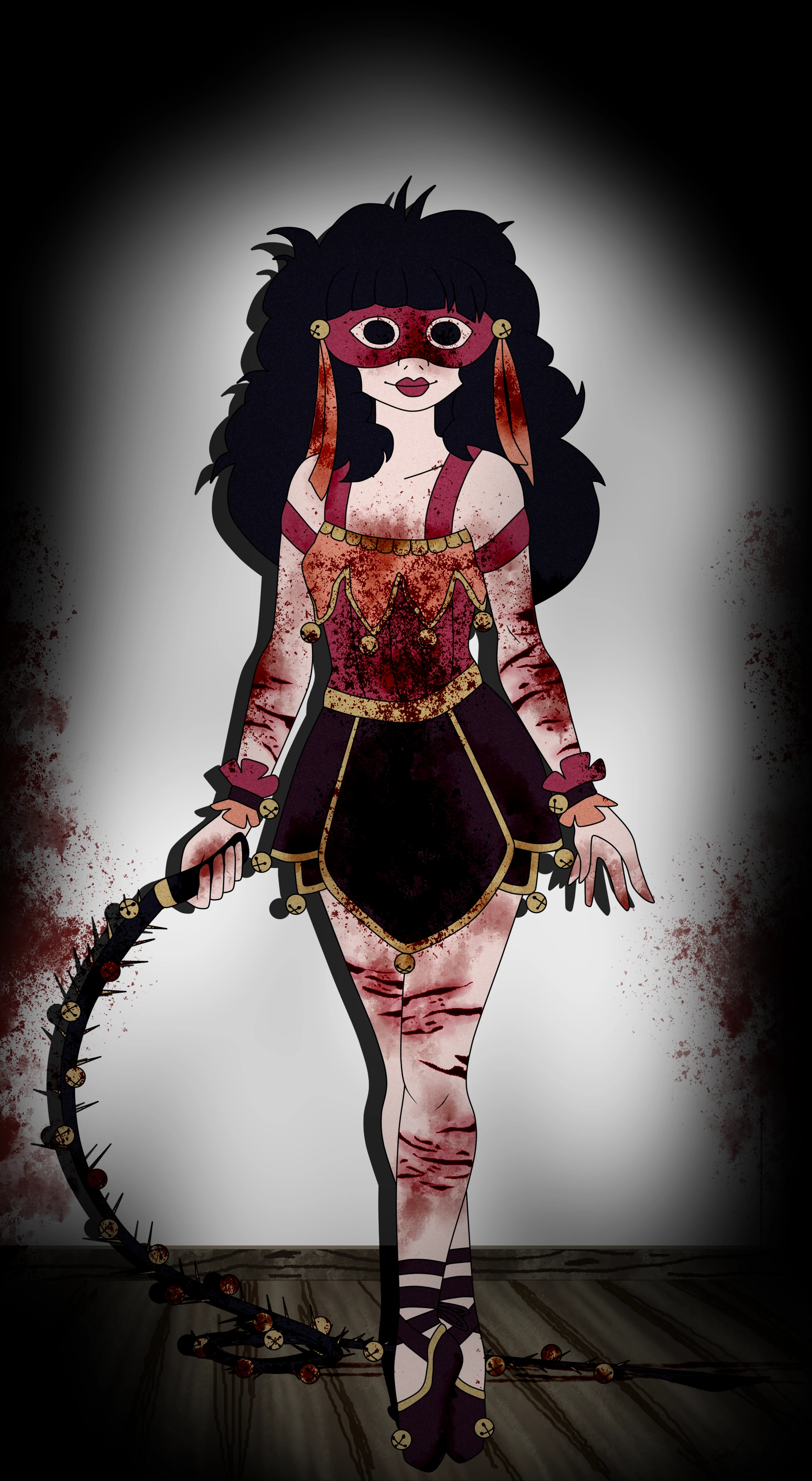 Yo no veía mi reflejo, sólo podía ver a esa endemoniada figura, que además estaba vestida con unas ropas muy extrañas, como una trapecista, acróbata de circo o algo por el estilo: tenía un antifaz color naranja vivo, una falda negra muy corta, una especie de pupera ajustada anaranjada hasta la cintura, totalmente gastada, destrozada y llena de sangre, con mangas largas negras y sueltas, y un par de zapatos de ballet terminados en punta; estaba adornada y colmada de cascabeles colgando de su cintura, las mangas de la remera y en las puntas de sus zapatillas de tela. Una demente sonrisa estaba dibujada en su rostro, y sus labios estaban teñidos de color carmesí, un intenso color rojo, brillante y oscuro a la vez. Pero lo que más me inquietó y aterrorizó fue lo que llevaba en la mano derecha, mano que estaba por cierto inhumanamente desfigurada por lo que parecían ser cortes, y a pesar de que estaba vendada, las heridas y la sangre estaban expuestas: llevaba en esta una cadena muy larga, aparentemente hecha de un metal pesado, llena de púas tan grandes como clavos, toda cubierta de sangre, y terminada en ambos extremos con dos cascabeles de las mismas características. Pero lo definitivamente peor de todo ocurrió cuando observé detenidamente hacia esas dos siniestras y lúgubres esferas de metal, y mis ojos presenciaron al sufrimiento y el dolor en persona: Cuando miré en el centro de uno de ellos, en la parte hueca, dentro de este se reflejaban los rostros de miles de niños, todos llenos de magulladuras y tajos, todos ellos llorando y riendo a la vez, algunos corriendo en círculos, otros sentados en posición fetal, atados con vendajes y cadenas, todos desfigurados y clavándose objetos puntiagudos, mientras gritaban de dolor y gemían, haciendo lo mismo una y otra vez, atrapados un ciclo de eterna tortura de jamás acabaría.
