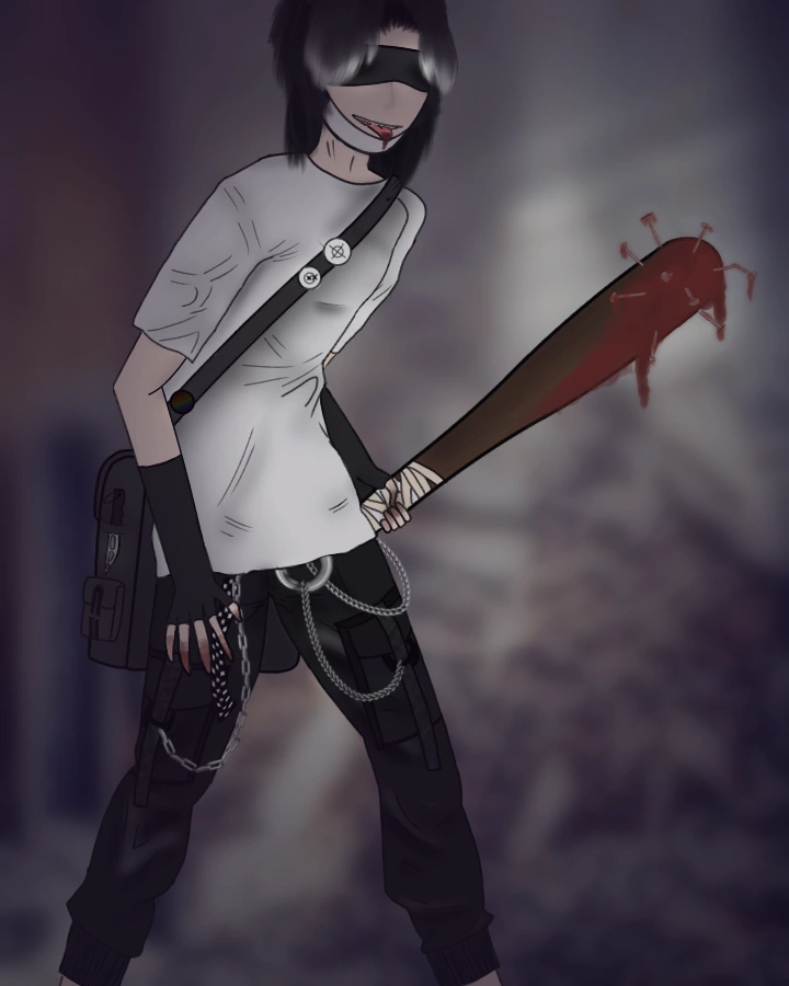 Maintenant Enola mesure un peu plus de 1m 70, pour un âge de 16ans et demi, elle porte un sweat à capuche blanc, son bonnet noir, un pantalon battel noire a sangle avec une ceinture à carreaux noirs est blanc et ces chaines (pas très pratique pour courir, mais utile pour frapper quand les battes sont oubliées), des chaussures montantes, une noire à lacets blancs au pied gauche et une blanche à lacets noirs au pied droit. Elle porte un masque qu’elle ne met que quand il y a beaucoup de monde et un bandeau noir sur les yeux avec le quel elle peut voir au travers. Elle possède un sac et deux battes avec elle, une avec des clous rouiller et une avec des barbelés qu’elle perdra durent un assassina.