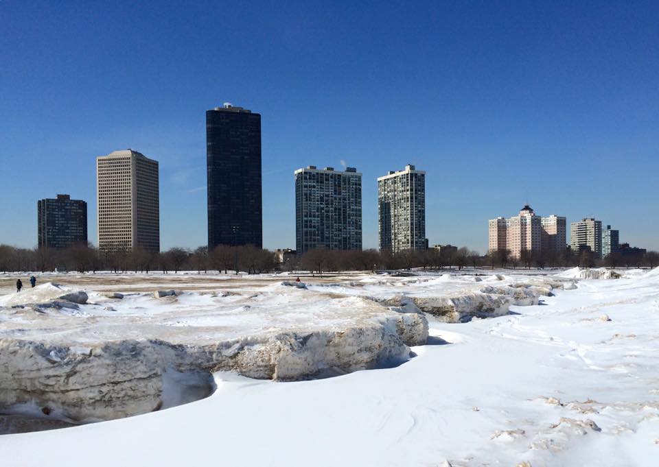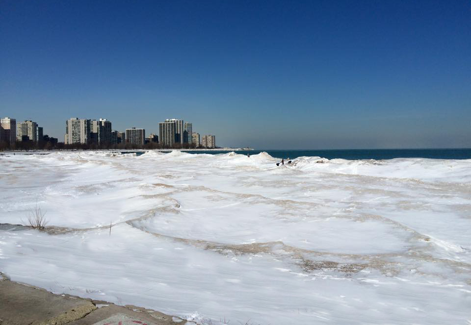 When she arrived, she shaded her eyes looking north and south, trying to take it all in at once. “This is amazing!” she said. The famously flat city now had a temporary topography of sparkling hills and mountains that stretched unbroken to the horizon. Far off shore, a water crib painted like a red and white circus tent floated in a shimmering fata morgana of blue sky. The only sound Sadie could hear in a city of three million residents was the creaking of the ice as the lake sleeping beneath shifted under its heavy blanket.