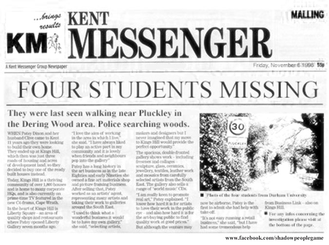 The Dering Wood was home for another mystery when on October 1998, on the same night of fifty years before, four college students who were visiting the forest went missing after people from Pluckley reported seeing "figures of light similar to spider webs" in the sky. Their bodies were never found and after three weeks, the police investigation stopped.