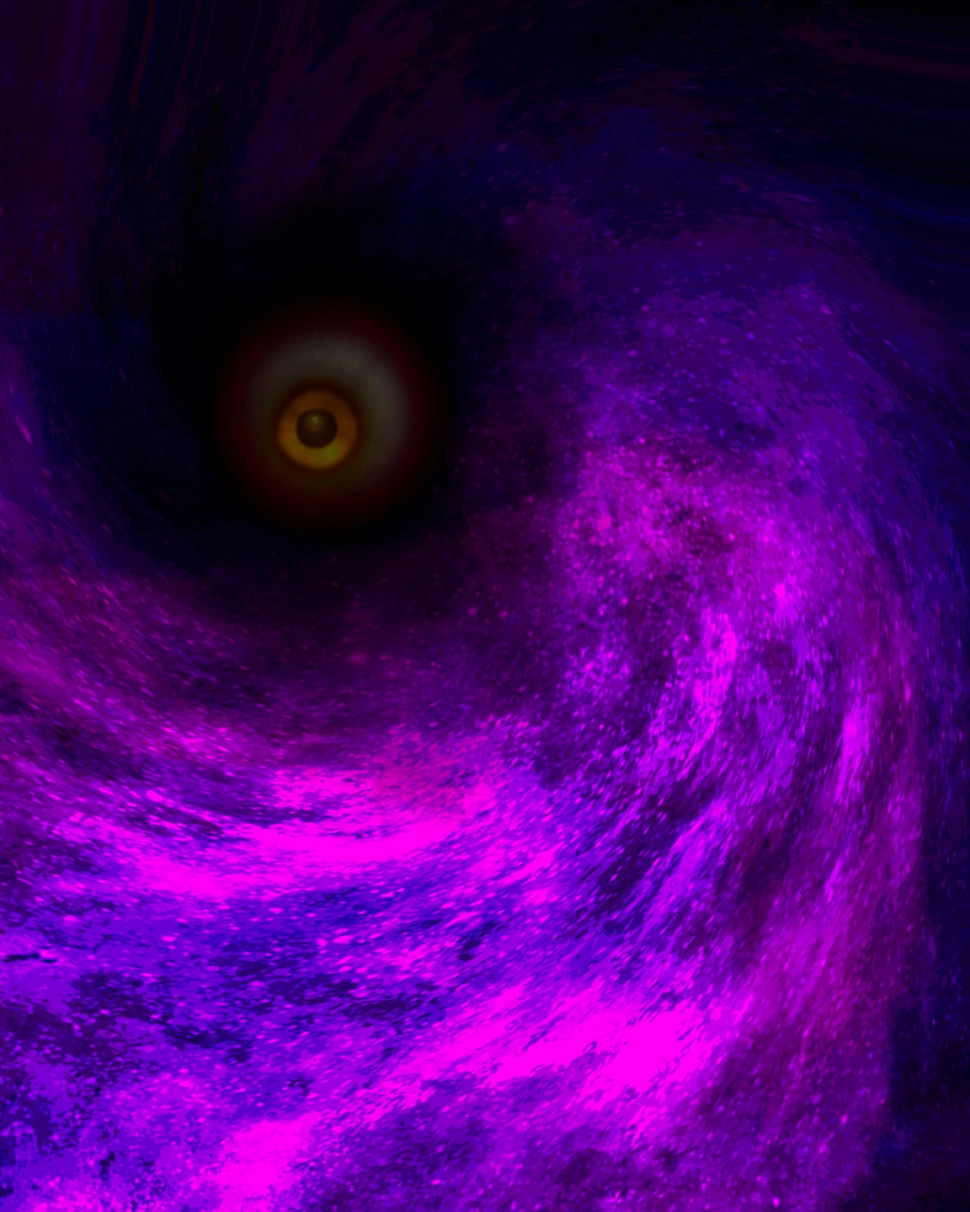 Above the hungry growls and gnashing of teeth, I suddenly hear what sounds like deep, guttural throat singing, reverberating throughout this fungus infested ghost town. All other noises seem to cease as this mesmerizing song begins to get louder, and I finally look up. The first thing I see in the sky is a solitary eyeball with a yellow iris, pulling the violet nebula toward it like a black hole. This thing has to be astronomically huge, for it to not only bend space around it like that, but to appear so clearly from earth, if I’m even still on Earth. All the fungi are also looking up in vile reverie, but they are all making hissing noises that seem rather spiteful, or even fearful.