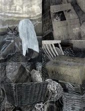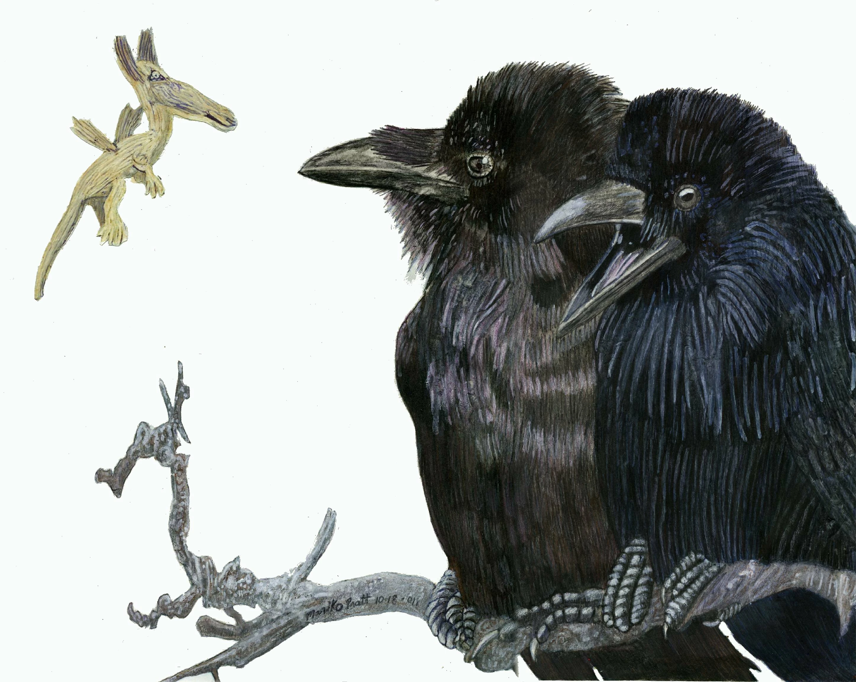 Whenever I have trouble coming up with new story ideas or illustrations, I do ravens. Here we have a couple of these birds discussing about a (Macropus blanfordii) or Flying kangaroo.